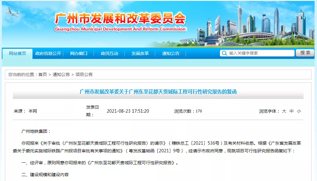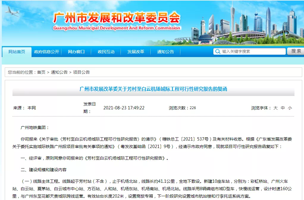 8月23日,广州市发改委在官网上发布了关于广州东至花都天贵城际工程可行性研究报告的复函以及关于芳村至白云机场城际工程可行性研究报告的复函。