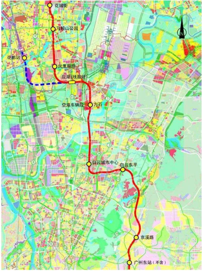 新建7座车站,分别为:京溪路站、白云东平站、白云城市中心站、方石站、凤凰南路站、马鞍山公园站、花城街站。