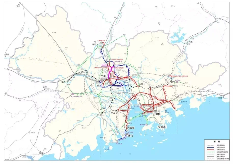2020年7月30日国家发改委公布了《关于粤港澳大湾区城际铁路建设规划的批复》,涉及广州的线路包括广州东至花都天贵城际、芳村至白云机场城际、佛山经广州至东莞城际、南沙至珠海(中山)城际。据悉,这些线路都可在建设条件落实后有序推进。