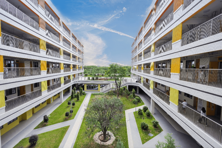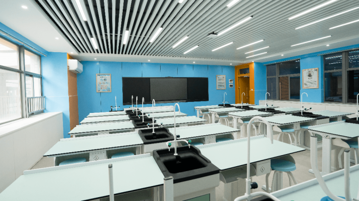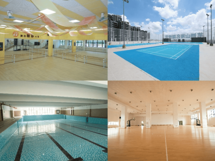 广东仲元中学莲花湾学校总建筑面积约5.3万平方米,包含教学楼、户外标准跑道、标准足球场、可容纳600人的明德报告厅、高标实验室等。校园中还坐落着一座多功能体育馆,其建面约6000平方米,首层设标准泳池,二三层分别分布着5个羽毛球场与3个篮球场,天台为标准网球场,为学生的素质教育提供多元化场景。