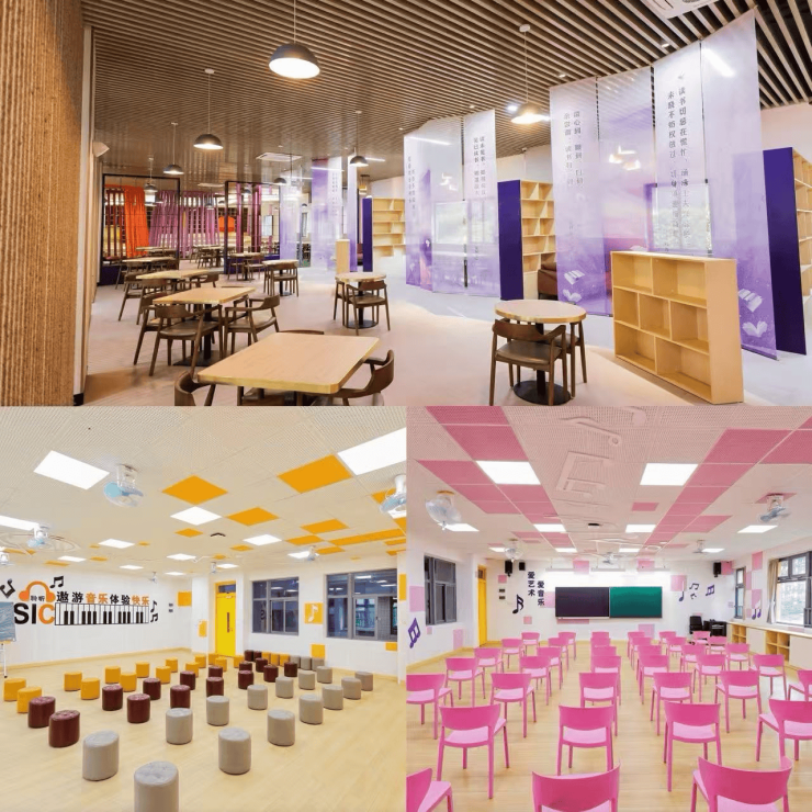 在空间营造上,学校巧妙地将社区楼体的弧形线条植入教学楼的建筑语言中,呼应“自山望海”的阶梯式布局,通过景观平台、屋顶花园、回环式外廊等建筑要素,将海洋、天空、绿植引入校园的每一个角落,让自然环境成为最生动的教材。
