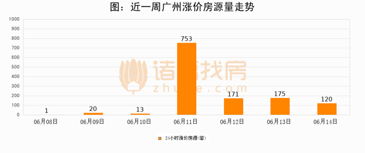 根据诸葛找房数据显示,广州24小时涨价房源量为120套,较06月13日减少55套,环比下降31.4%。与此同时,涨价房源占比小幅回落,对于购房者来说是一个入市窗口期,购房者可抓住时机入市。