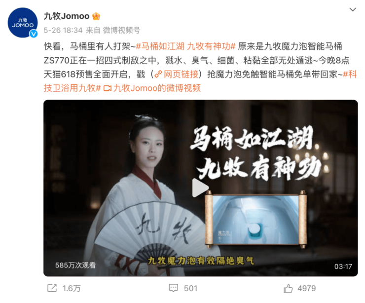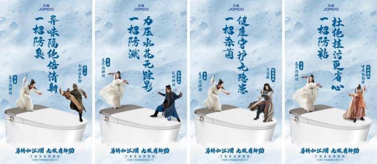此次618期间,针对智能马桶消费人群的怀旧情怀,九牧从武侠江湖汲取灵感,发起以“马桶如江湖,九牧有神功”系列营销活动。在营销创意中放大魔力泡功能点,使魔力泡防溅、杀菌、除臭、防粘的科技神功可视可感。