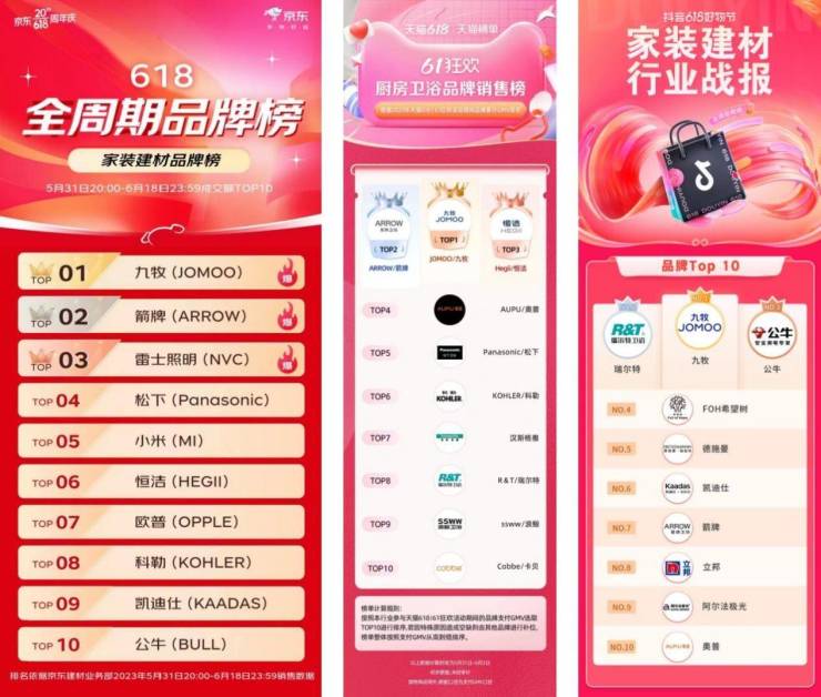 九牧创意玩转科技神功,“马桶如江湖,九牧有神功”营销活动在全网收获1.6亿曝光量、超30万的互动量。九牧魔力泡免触智能马桶ZS770,仅上市1月就成为京东智能马桶第一爆款产品。在江湖破圈营销助力下,今年618,九牧从预售开始,一路引领,势如破竹,开门红6分钟破亿,23分钟超去年全天,全周期销售额同比增长65%,斩获天猫、京东、抖音等多平台品牌&店铺销售第一,再一次卫冕创新高。