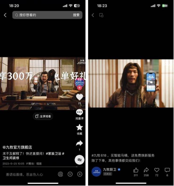 不仅如此在抖音上,九牧联合垂直类家居达人创作短视频,从消费者角度讲解九牧魔力泡免触智能马桶ZS770的产品功能点,触达更多潜在消费群体,使他们对九牧魔力泡科技有更深刻的产品认知,为产品做深度种草。