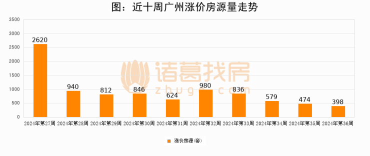 从调价房源来看,第36周广州涨价房源398套,较上周下降16%。与此同时,36周涨价房源占比提升0.28个百分点,业主信心持续恢复。