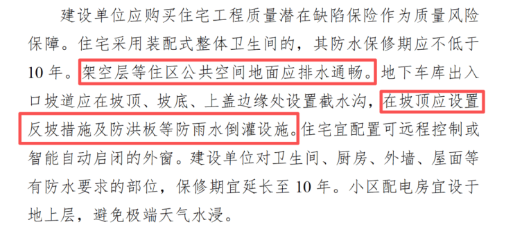 除此之外,文件还提出,针对广州多雨的气候特点,住宅区架空层等公共空间需保障排水通畅,地下车库出入口坡道需在坡顶、坡底、上盖边缘设截水沟,坡顶需设反坡措施及防洪板。