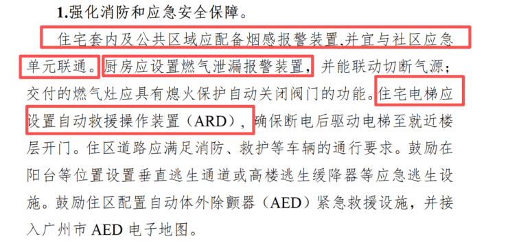 住宅套内及公共区域需配备烟感报警装置,电梯需设置自动救援操作装置,厨房强制设置燃气泄漏报警装置。
