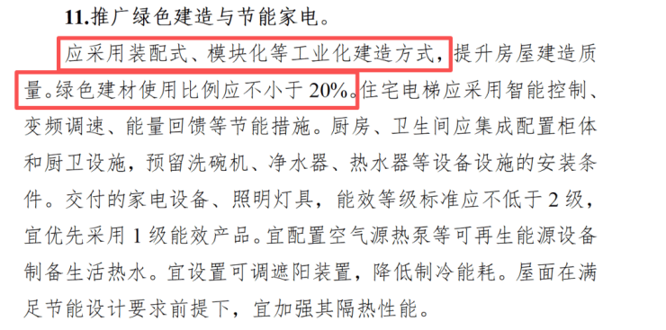 要求使用装配式建筑,绿色建材的使用比例≥20%。