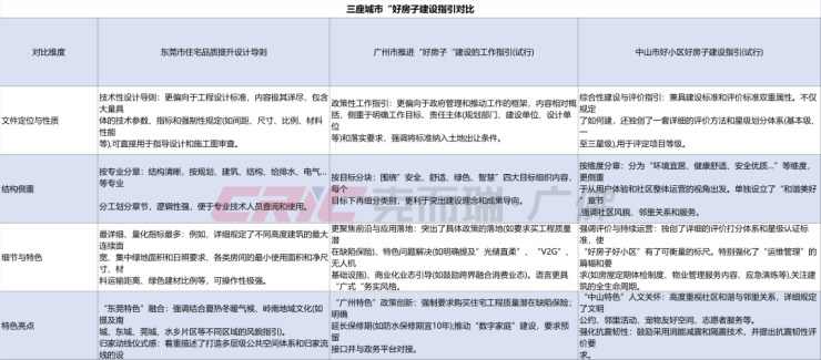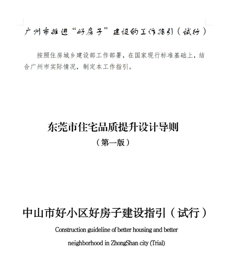 文件的不同之处,中山、东莞对于“好房子”提出了详细的建设标准,广州则是整体以“指南针”为主,给予开发商更多发挥空间。