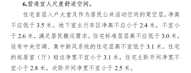 例如住宅标准层高不应低于3.0米,首层大堂和架空层的净高不低于3.5米……起居室短边净宽不宜小于3.1米,主卧开间净宽不宜小于2.8米。