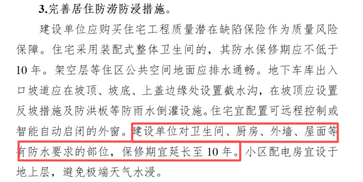 值得一提是的,广州还提出,厨房、卫生间、外墙、屋面等有防水要求的部位,保修期宜延长至 10 年,而以往这一保修年限为为5年。