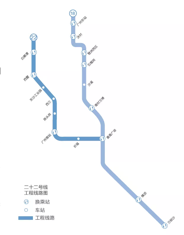 按照计划,地铁22号线首通段(番禺广场-陈头岗)也将于今年底开通,该线路定位为广州南站快线, 实现了南沙、番禺、荔湾与广州南站的快速轨道交通联系,并增强广州南站的综合交通枢纽功能。