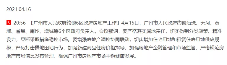 4月15日,广州市人民政府就房地产工作约谈海珠、天河、黄埔、番禺、南沙、增城等6个区政府负责人,特别要求各区按照分区精准施策的原则,进一步做好分类指导和精准施策。