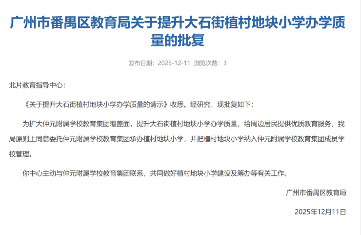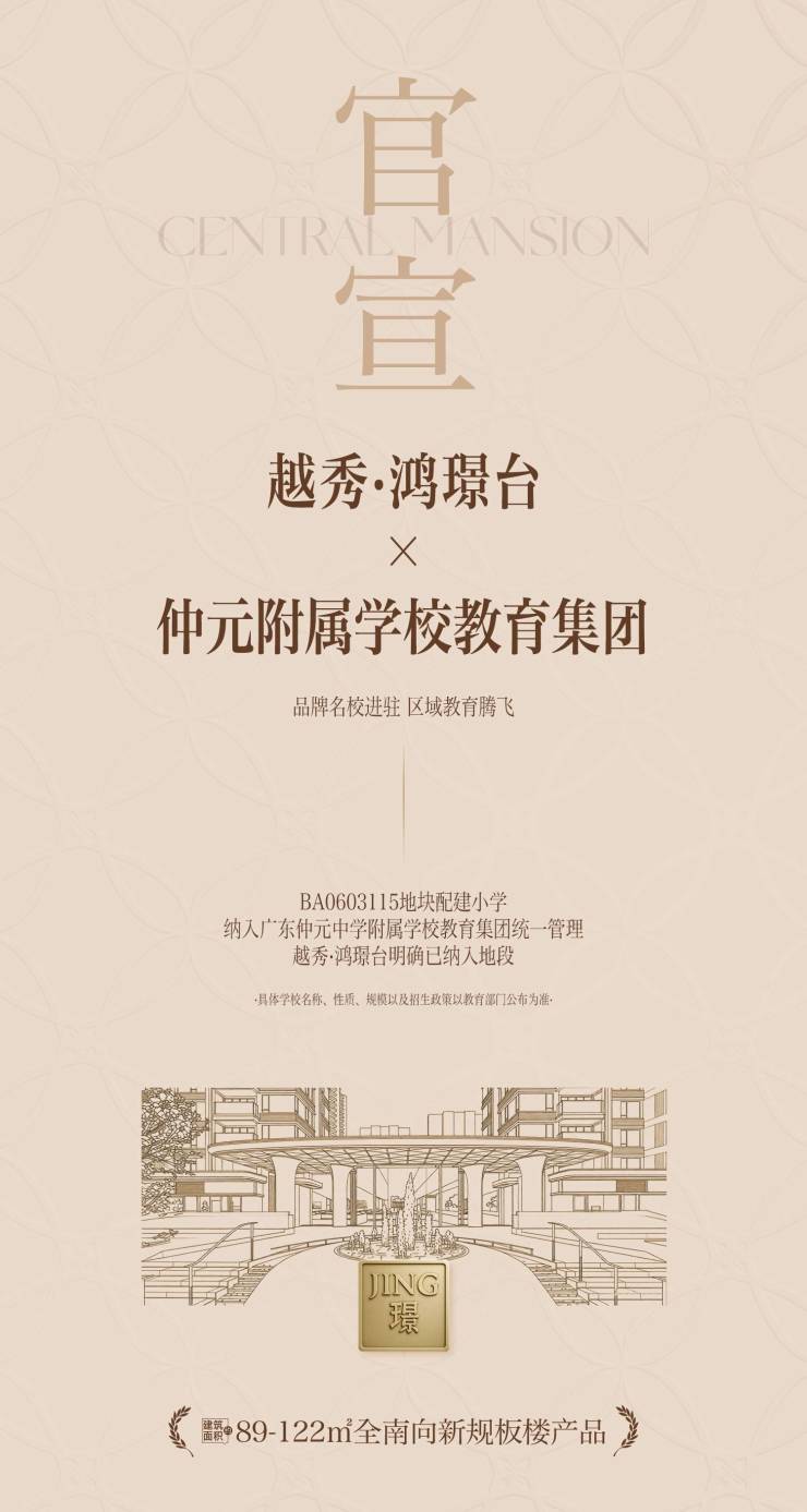 根据广州市番禺区教育局相关文件确认,越秀·鸿璟台项目在BA0603115地块配建小学的招生地段范围,且该校建成后将正式纳入仲元附属学校教育集团统一管理!