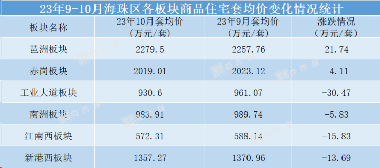 小编对比了9、10两月海珠区各板块的商品住宅套均价涨跌情况,发现10月份海珠区仅有琶洲板块商品住宅套均价较9月上升,其余板块套均价较9月份出现略微回落。