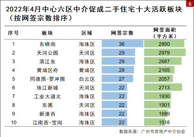 4月份,中介促成十大活跃板块方面,东晓南板块和天河公园板块稳坐排名前列位和第二位,但网签宗数环比分别下降12.20%和14.71%;滨江东板块跃至第三位,网签宗数环比增长52.63%。
