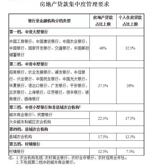 记者注意到,在“两道红线”政策的文件中,央行和银保监会根据不同的机构类型,划分不同的房地产贷款集中度。其中,针对中资大型银行,房地产贷款占比上限为40%,个人住房贷款占比上限为32.5%。而中资中型银行的上限则分别为27.5%和20%。