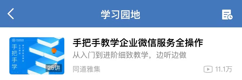 作为企业微信官方培训服务商,同道雅集的线上精品课《企业微信营销进阶课》在官方平台「学习园地」上线,累计学习人次超11万。