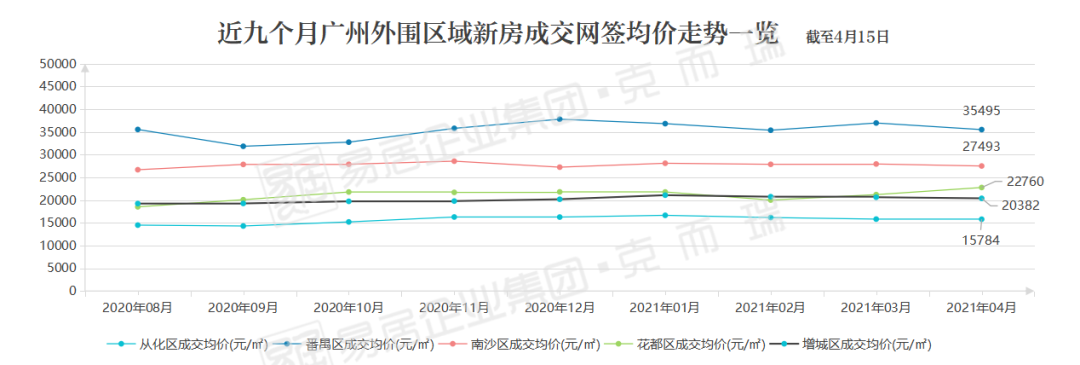 克而瑞整理了近9个月广州外围五区的网签均价,均价较为“亲民”的当属增城、从化以及花都三区,在2字头起步。
