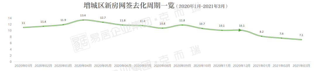 而克而瑞数据也证实了这点,数据显示,按近12个月去化周期计算,截至3月底,增城区新房去化周期为7.1个月,刷近16个月新低。