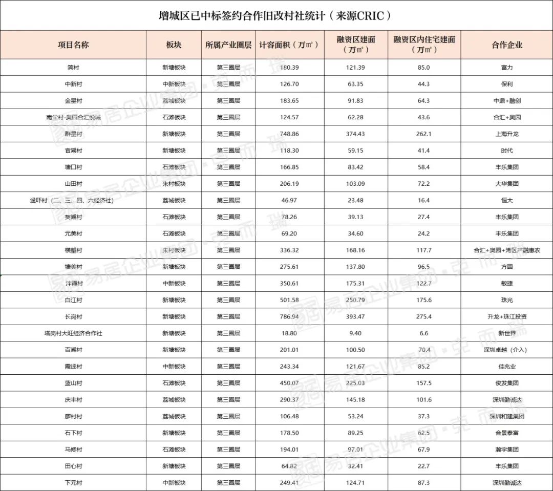 据克而瑞广佛团队市场统计,截至发稿时间,增城区合计46村纳入城市更新,仅次于番禺区(50村)、黄埔区(70村),旧改规模体量庞大。