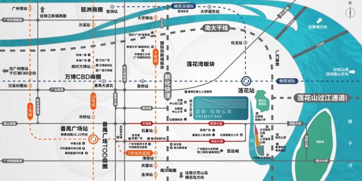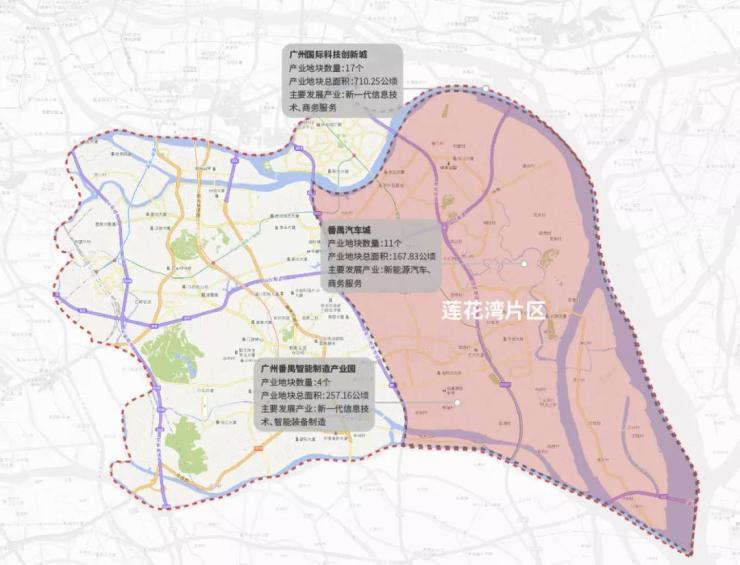 莲花湾片区起笔于广州十四五规划和番禺政府工作报告,目前广汽智联新能源汽车产业园、广州思科城、华南高教中心大湾区智脑(含广州大学城)等产业集聚于此,千亿级投资逐步落地,潜力无限。