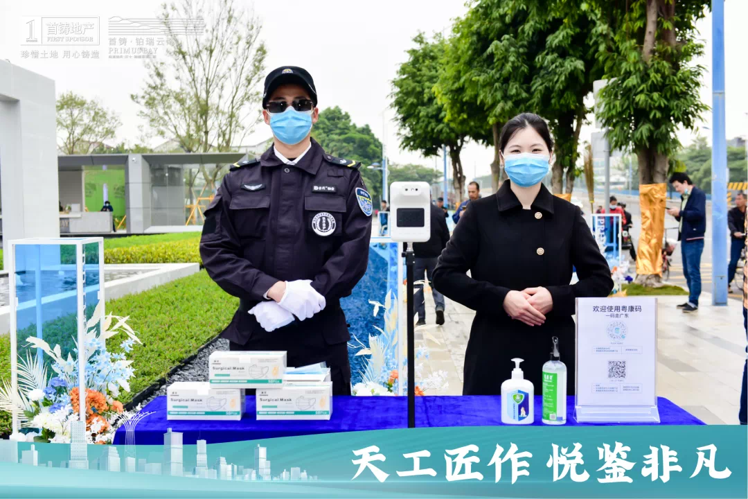 出于疫情防控考虑,首铸·铂瑞云湾在入口处设置了体温检测、粤康码验证等流程。现场工作人员协助来宾们顺利通行,即使再忙碌也完全hold得住,一切都在有序进行中。