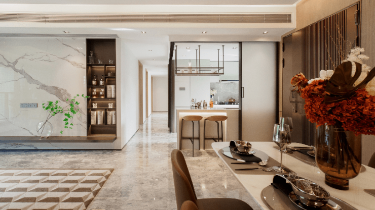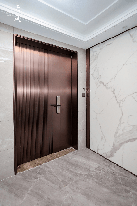 大平层专属的入户大堂,提升归家的舒适感与私密感。私家电梯厅作为赠送空间,轻松收纳生活琐碎。玫瑰金子母门,搭配指纹、密码、刷卡、钥匙四合⼀松下智能⻔锁,让整体门第感更强,归家更具仪式感;