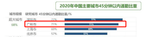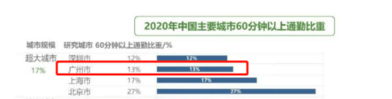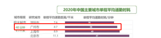 去年,住建部与中国城市规划设计研究院联合发布《2021年度中国主要城市通勤监测报告》显示,广州城区通勤半径31公里,单程平均通勤距离8.7公里、单程耗时38分钟,45分钟通勤比重达到79%,超过60分钟的通勤比重仅为13%。