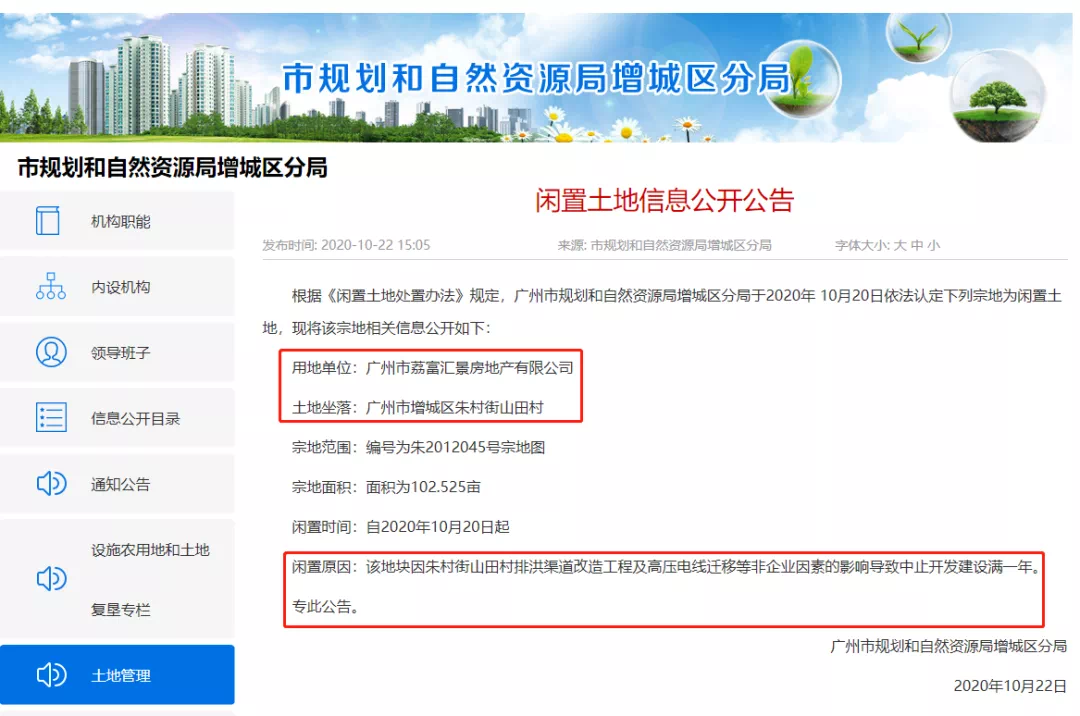 10月22日,增城区政府官网发布了一份闲置土地信息公开公告!