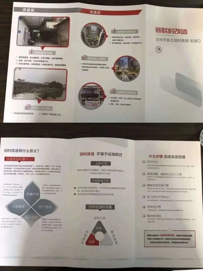 新联村在2018年时就已经提出旧改。当时村里祠堂都贴上了关于旧改的宣传海报,还向村民发放旧改宣传手册、普及旧改相关的案例。