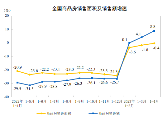 据国家统计局报告显示,全国1—4月份,商品房销售面积37636万平方米,同比下降0.4%,但细分到住宅销售面积却增长2.7%,商品房销售额增长8.8%,其中住宅销售额增长11.8%。