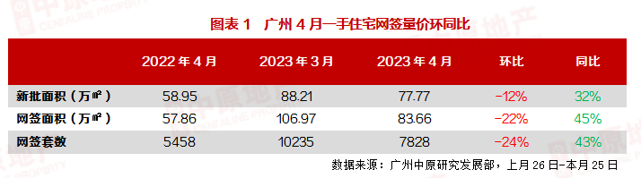 但聚焦到广州,广州4月一手住宅网签套数仅为7828套,环比下降24%。