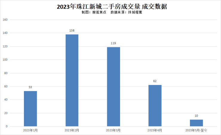 我们可以看到,5月份已经过半了,珠江新城的二手房数据才刚刚破二位数。即使是2022年豪宅成交最低谷的二月份,也有28套。