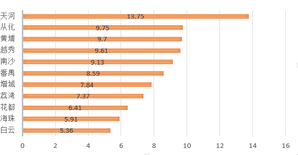 首位仍为天河,人气指数均值为13.75。第二名则从上个月的越秀,变为从化,人气指数均值为9.75。第三名仍为黄埔,越秀降到第4名。南沙关注度上升,从第9升到第5。
