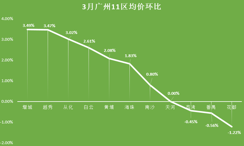 值得关注的是,虽然黄埔区的均价环比仍在上涨,但涨幅已经明显回落。2月份,该区环比涨幅排在全市各区首位,高达9.8%,而3月份,环比涨幅已降到2.08%。
