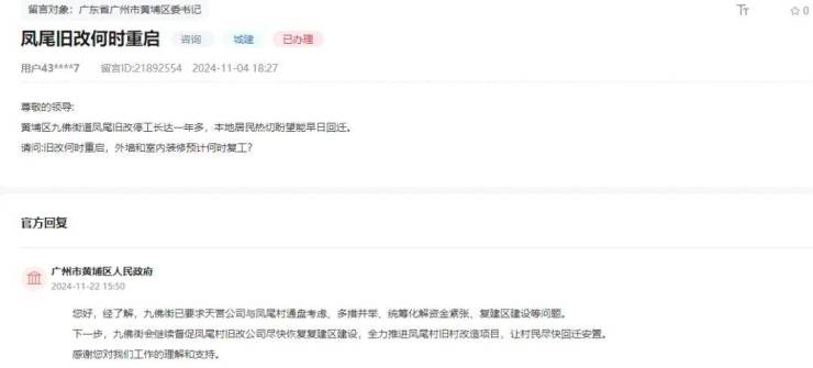 凤尾村旧改项目也出现了类似的问题。因广州老牌房企天誉置业暴雷,其一度停滞不前。