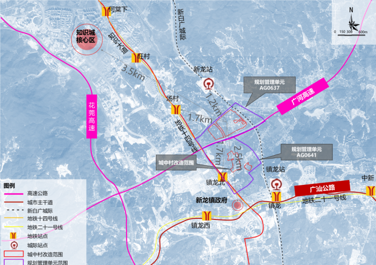 新联片区位于知识城核心区东南侧3.5公里处,地理位置优越,交通条件便利。项目毗邻广河高速、知识大道等区域交通干道,周边有地铁十四号线汤村站、镇龙北站,新白广城际新龙站等轨道交通站点,周边交通基础设施较为完善,区位条件较好,是连接广州中心城区、河源等地市的重要节点。