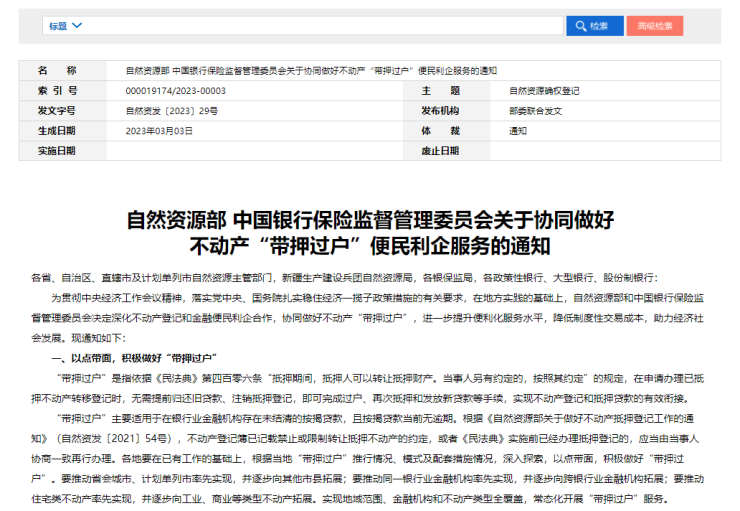 为进一步优化营商环境,提升便利化服务水平,降低制度性交易成本,满足人民群众对财产权高质高效保护的需求,自然资源部、中国银行保险监督管理委员会印发《关于协同做好不动产“带押过户”便民利企服务的通知》,对协同做好不动产“带押过户”做出全面部署。