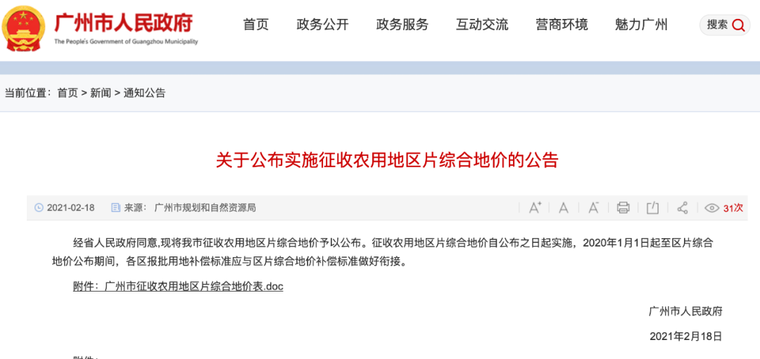 2月18日,广州市人民政府官网公布较新的征收农用地的报价!报价由土地补偿费和安置补助费两部分构成!