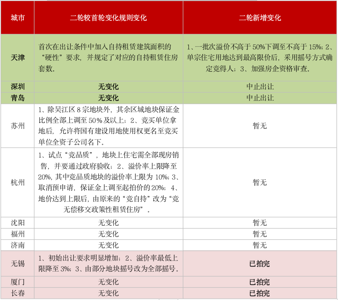 表:已发布二轮集中供地公告城市二轮供地规则变化及新增变化