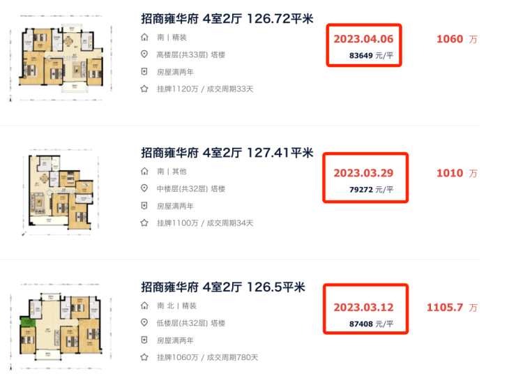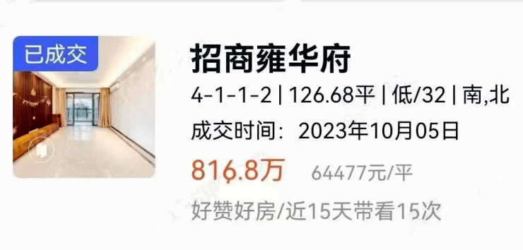 另外一个天河网红盘招商雍华府最近10月初成交了一套126㎡四房,单价64477元/㎡,总价816万。