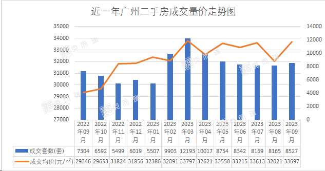 克而瑞数据监测显示,近一年广州成交10.49万套二手房,其中新政密集的9月广州二手房成交8527套,环比增长4.43%,同比增长17%;从月度走势图来看,结束了连续5个月的下跌,在9月迎来了上涨。价格方面,9月二手房成交均价33697元/㎡,环比上升5%。