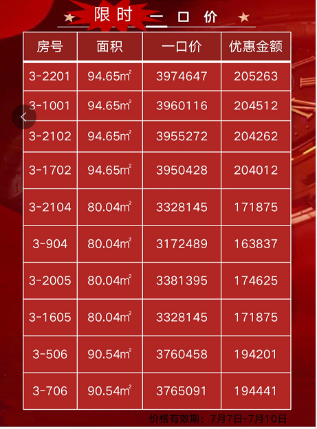 同样位于白云湖片区的【首开保利.云湖壹号】本周末推出众多限时一口价单位!本次特价单位的期限仅限于7月7日-7月10日,大家要注意时效性。