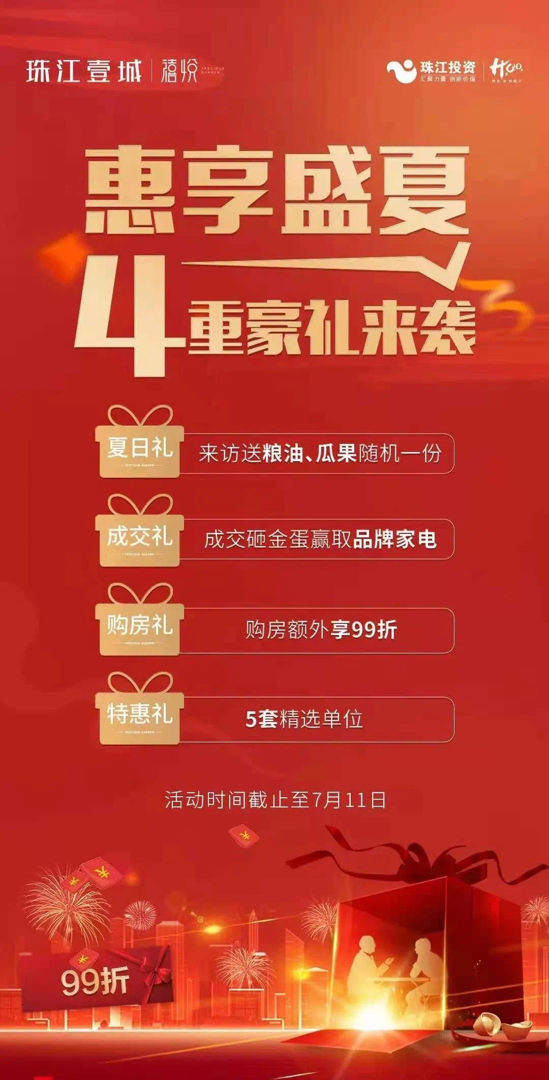 位于从化的【珠江壹城】本周末推出4重豪礼,如夏日礼、成交礼、购房礼、特惠礼等。而其中购房可额外享受99折、还推出5套特价单位。