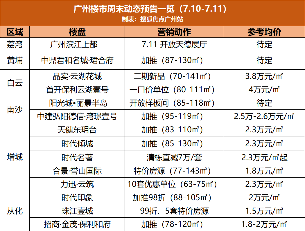 据搜狐焦点不完全统计,本周末有14盘有营销动作,项目主要以加推、特价单位、开放展厅等为主;中心区域如荔湾广船片区的广州滨江上都也开放了展厅。