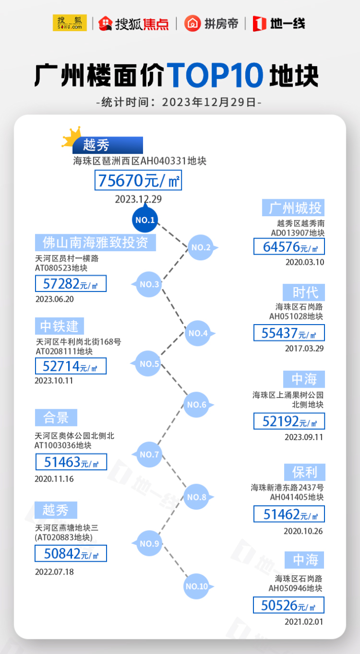 一方面,在近几年的土拍中,海珠的拍地楼面价一次又一次刷新大众眼球。从搜狐焦点统计的广州楼面价TOP10地块中,可见,海珠占据了半壁江山。