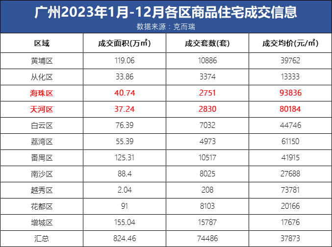 另一方面,继2022年海珠新房成交均价赶超天河后,根据克而瑞数据显示,2023年海珠新房成交再次赶超天河,以93836元/㎡的均价问鼎全市。