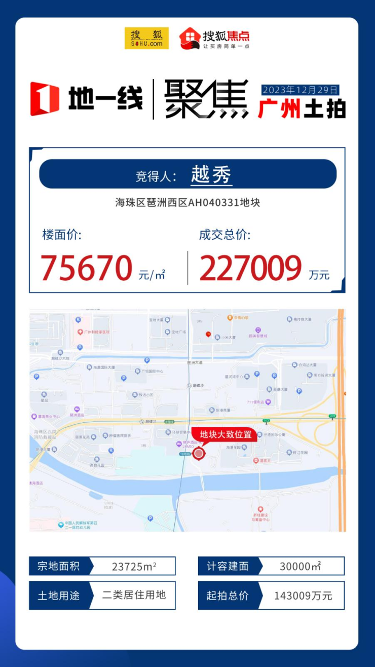 2023年12月,备受市场关注的琶洲西区AH040331地块经过85轮激烈角逐后,最终由越秀地产以总价约22.7亿元成功竞得,折合楼面价75670元/平方米,成为广州楼面价“王者”。